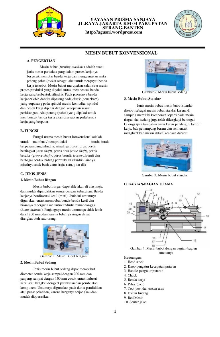 Mesin bubut yang mempunyai alas mesin pendek, digunakan membubut benda berdiameter besar adalah. Soal ulangan harian uh teknik pemesinan nc cnc dan cam ini admin buat dengan tujuan semoga bisa membantu bapak ibu guru dan siswa dalam proses belajar dan mengajar. Pada mesin bubut standar terdapat beberapa alat perlengkapan mesin diantaranya: Pendahuluan mesin bubut merupakan salah satu metal cutting machine dengan gerak utama berputar, tempat benda kerja dicekam dan berputar pada sumbunya, sedangkan alat potong (cutting tool) bergerak memotong sepanjang benda kerja, sehingga akan terbentuk geram. Bubut sendiri merupakan suatu proses pemakanan benda kerja yang sayatannya dilakukan dengan cara memutar benda kerja kemudian dikenakan pada pahat yang digerakkan secara translasi sejajar dengan sumbu putar dari benda kerja.