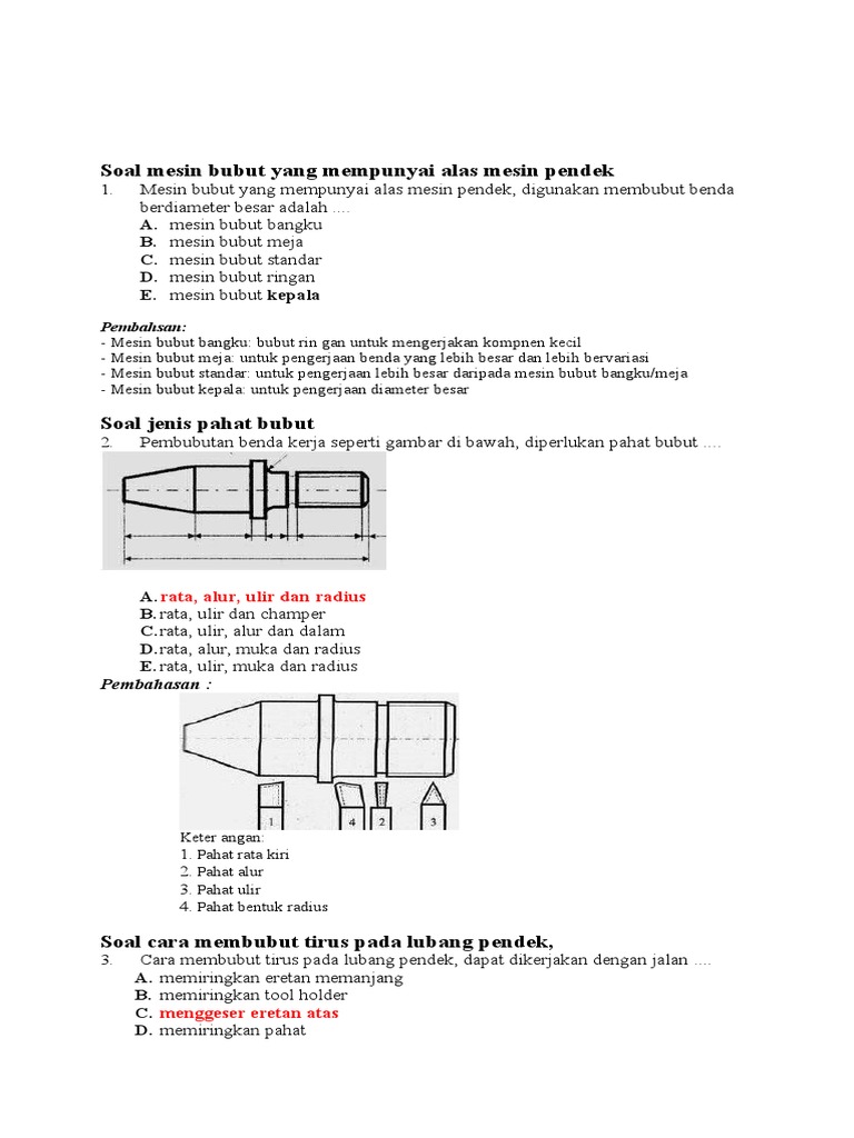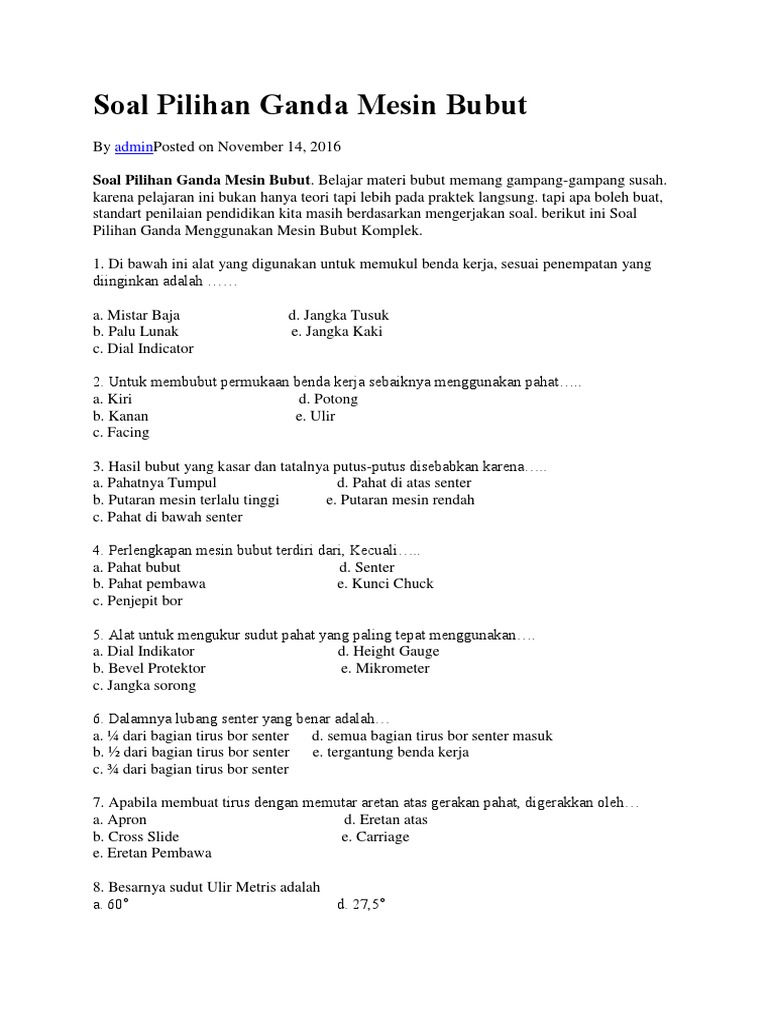 Contoh soal mmod | m akbar r. Latihan soal cnc materi soal. Mesin perkakas yang proses kerjanya bergerak memutar benda kerja menggunakan mata potong pahat (tools) sebagai alat untuk menyayat benda kerja mesin proses produksi yang dipakai membentuk benda kerja yang berbentuk silindris pada prosesnya benda kerja terlebih dahulu dipasang pada chuck semua benar 2. Mesin bubut ringan mesin bubut ringan (gambar 5) dapat diletakan di atas meja, dan mudah dipindahkan sesuai dengan kebutuhan, benda kerjanya berdimensi kecil (mini). Bagian terpenting pada mesin bubut yang mempunyai fungsi memutarkan benda kerja, dan tempat transmisi putaran adalah.